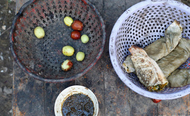 Trong nhà chẳng còn thức ăn gì cho 3 miệng ăn, chỉ có bánh mỳ với nước sốt, rổ bên cạnh là những quả táo mà ông hái cho con ăn vặt