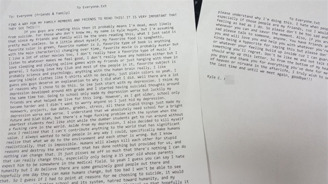 Sau đây là nội dung lá thư gửi "Everyone", đã được chuyển hóa sang tiếng Việt HÃY TÌM CÁCH ĐỂ NGƯỜI THÂN TRONG GIA ĐÌNH VÀ BẠN BÈ TÔI ĐỌC ĐƯỢC LÁ THƯ NÀY! ĐIỀU NÀY RẤT QUAN TRỌNG! Khi mọi người đọc được lá thư này thì mình đã chết rồi, chết vì tự tử. Với những ai không biết, xin giới thiệu, tên mình là Kyle H., điều này hơi thừa với những ai đang đọc thư là bạn bè và người thân của mình. Xin nói một chút về mình, món ăn mà mình thích là spaghetti, màu mình thích là xanh lá cây, số mình thích là số hai, truyện mình thích là bất cứ truyện nào mà nhân vật chính thay đổi hoài, phim mình thích dĩ nhiên là Avatar nhưng mình cũng thích nhiều phim khác nữa, nhạc thì mình nghe bất cứ loại nào khiến mình cảm thấy thoải mái. Mình thật sự không có thú vui giải trí nào hết, mình chỉ thích ngủ và chơi game trên mạng với bạn bè hoặc đi chơi với họ. Mình rất là yêu nhóm Key Club và hầu hết thành viên trong nhóm. Môn học mình thích là khoa học và tâm lý, bất cứ cái gì thật sự có liên quan đến trí tuệ con người. Mình thích mặc áo quần đơn giản như áo thun không có hình vẽ, chỉ một màu trơn thôi. Mình nghĩ là mọi người xứng đáng được nghe lời giải thích tại sao mình lại hành động như thế. Vâng, có nhiều lý do để mình chọn cách hành xử này. Bắt đầu từ sự chán nản của mình. Mình nghĩ nỗi buồn chán đã nhen nhóm phát triển trong mình từ năm học lớp 4, những ý nghĩ về việc tự tử cũng manh nha từ khi ấy. Việc đến trường chỉ làm cho nỗi chán chường của mình trở nên tệ hại hơn, nhưng thật là may mắn vì các bạn chính là niềm vui giúp mình sống đến hôm nay. Tuy nhiên, càng lớn, chuyện học hành càng trở nên khó hơn. Mình không muốn mọi người lo lắng, vì thế mình che giấu sự buồn chán của mình. Bài tập ở trường, các projects đến hạn nộp, điểm số, sự căng thẳng, tất cả những điều ngớ ngẩn đó chỉ làm cho nỗi chán chường của mình mỗi lúc một tệ hơn. Mình hiểu rằng chúng ta cần học hành cho một tương lai tươi sáng và những điều tương tự thế, nhưng vấn đề khốn nạn của hệ thống học đường là những học sinh thông minh nhất cảm thấy "bị nhồi nhét," trong khi những đứa dở hơn thì muốn làm gì làm, không cần quan tâm. Ngoài nỗi chán chường ra, mình còn quyết định kết liễu cuộc đời khi nhận ra rằng mình không thể đóng góp được gì có giá trị cho thế gian này. Mình luôn muốn giúp mọi người bằng mọi cách mà mình có thể, chính xác hơn là giúp loài người nhận ra rằng điều mà chúng ta làm đối với môi trường sống và đối với nhau là sai. Nhưng mình biết rằng điều đó là không thể. Con người luôn sát hại nhau bởi những lý do điên rồ và hủy diệt môi trường sống trong khi chúng chẳng làm gì nên tội ngoài việc giúp ích cho chúng ta mà thôi. Không gì có thể thay đổi được những việc làm đó. Đấy là điều khiến mình cảm thấy bức bối rất nhiều khi không thể làm được gì hết để tạo nên sự thay đổi, đặc biệt là với thằng nhóc 15 tuổi mà ba mẹ lại kỳ vọng nó đi vào lãnh vực y khoa. Mình hiểu là mọi người có thể cho rằng mình ghét thế gian này, nhưng mình vẫn tin còn có người thật sự tốt ở đâu đó, hy vọng một ngày nào đó họ có thể thay đổi nhân loại, nhưng thật là tệ khi mình không thể chờ đợi đến ngày nhìn thấy điều ấy. Nếu phải nói ra lý do vì sao mình tự tử thì đó chính là nỗi buồn chán, là căn bệnh trầm cảm, mình ghét việc học hành và hệ thống giáo dục, căm thù loài người và cảm thấy bất lực trong việc thay đổi thế giới. Mình viết lá thư này hy vọng rằng nó sẽ giải thích cho mọi người hiểu tại sao mình không thể tiếp tục sống lâu hơn nữa. Điều này không phải chỉ thoáng hiện trong đầu mình ở một đêm, mà nó đã kéo dài trong nhiều năm và đã đến thời điểm mình không muốn sống tiếp. Mình thật sự ao ước có một cách nào đó khiến mình vui hơn với những điều này, nhưng buồn thay, niềm ao ước đó không có. Mình cũng hy vọng rằng lá thư này sẽ khép lại những ưu tư của mọi người về cái chết của mình, sẽ làm cho nỗi đau của mọi người nhẹ vơi đi. Mình biết là mình ích kỷ khi kết thúc cuộc đời mình và là nguyên nhân của nhiều nỗi buồn, nhưng hãy làm ơn, làm ơn, làm ơn hiểu là tại sao mình làm như thế. Mình ghét thấy người ta buồn, người ta suy sụp, đặc biệt khi đó lại là những bạn bè của mình, vì mình không muốn ai khác cảm giác sự tồi tệ giống như mình từng cảm nhận. Vì vậy, làm ơn đừng buồn, hãy cố gắng tìm niềm vui bất cứ khi nào bạn có thể và tận hưởng từng giây phút đó. Cũng như khi bạn thật sự thấy chán nản hay buồn rầu, làm ơn nói ra với ai đó, bất kỳ ai. Bạn có bạn bè, có gia đình, đó là những người luôn sẵn lòng vì bạn và yêu thương bạn, giúp bạn bằng mọi cách để bạn vượt qua. Mình biết mình giống như kẻ giả d