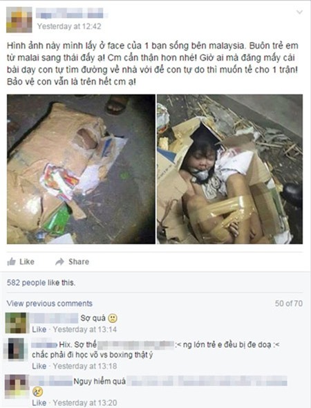 Bức ảnh được một tài khoản facebook có tên N.T.H chia sẻ với nội dung như sau: "Hình ảnh này mình lấy ở face của 1 bạn sống bên Malaysia. Buôn trẻ em từ Malaysia sang Thái đấy ạ! Các mẹ cẩn thận hơn nhé! Giờ ai mà đăng mấy cái bài dạy con tự tìm đường về nhà với để con tự do thì muốn tế cho 1 trận! Bảo vệ con vẫn là trên hết các mẹ ạ!"