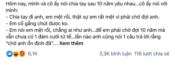 “Hôm nay, mình và cô ấy nói chia tay sau 10 năm yêu nhau, cô ấy nói với mình:
