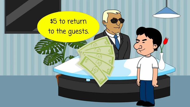 Họ không thể lý giải 1 USD còn lại đi đâu. Sau tất cả, 3 người trả 30 USD nhưng số tiền phải chi lại là 29 USD.