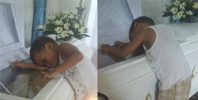 Em ngồi đấy, bên cạnh mẹ, úp mặt vào quan tài, quay qua, quay lại với gương mặt buồn rười rượi...