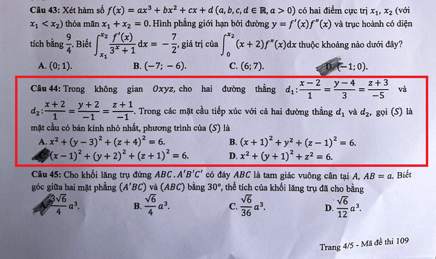Theo quy chế thi tốt nghiệp THPT, đề môn Toán gồm 50 câu trắc nghiệm với thời gian làm bài là 90 phút. Như vậy, nếu tính trung bình, mỗi câu hỏi và cả câu số 44 này sẽ có thời gian làm bài là 1,8 phút (tức thí sinh có trung bình chưa đầy 2 phút để xử lý mỗi câu). Tuy nhiên, với những thí sinh có học lực tốt, có thể xử lý những câu hỏi dễ với thời gian nhanh chóng và dành nhiều thời gian hơn cho câu hỏi này.
