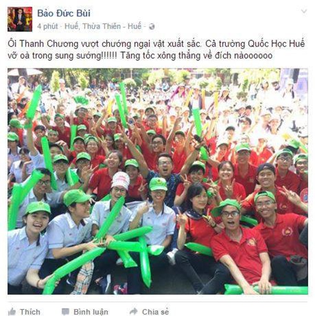 "Hãy mang "nguyên khí" của Quốc Học đến trường quay và chiến thắng trở về Thanh Chương nhé! Hãy luôn mạnh mẽ, tự tin, bởi mọi người - tất cả học sinh Quốc Học đều đứng phía sau Chương, là chỗ dựa vững chắc nhất cho Chương để thi đấu hết mình, nỗ lực hết mình và cháy hết mình! Quốc Học đợi tin vui từ Chương! Cố lên", những lời chúc của các thầy cô bạn bè gửi đến Hồ Đắc Thanh Chương.