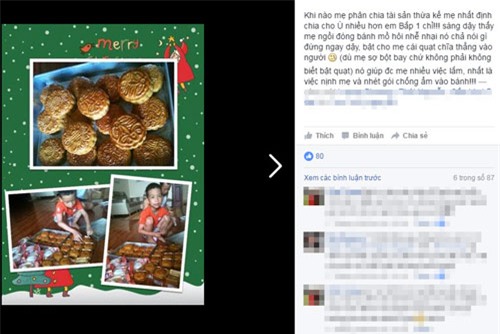 Mình bảo: "Con thấy anh nói chưa? Mẹ thì mệt, cơm mẹ còn chưa ăn, bụng mẹ đang đau vì đói đây con làm mẹ buồn lắm'. Rồi bảo Đức Anh ra ngoài ngủ với bố. Đức Anh lẳng lặng đóng cửa phòng đi ra. Vài phút sau lạch cạch mở cửa, bưng 1 khay cơm đặt ngay ngắn xuống giường bảo mẹ ăn đi không đói", chị Mai chia sẻ.