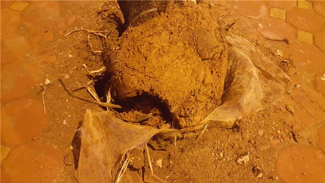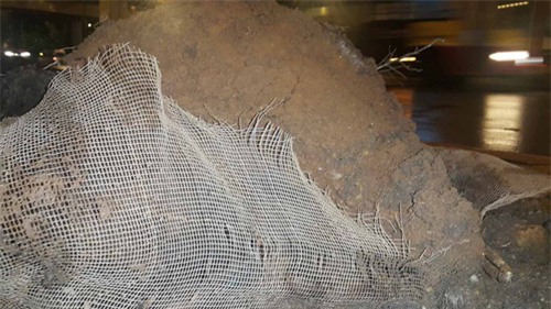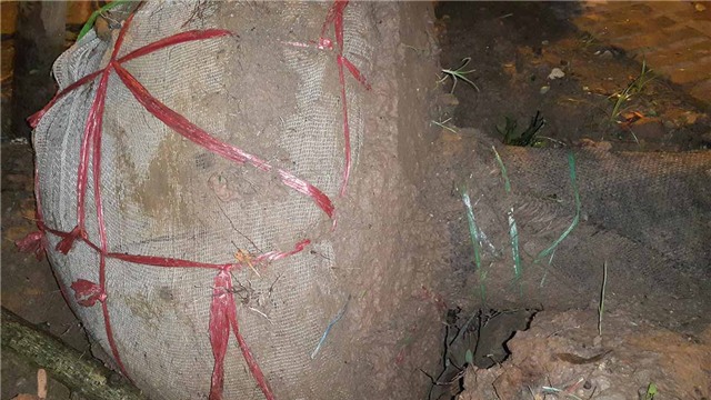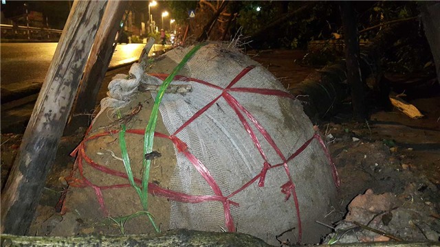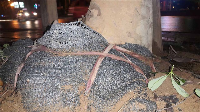 Các gốc cây mới được trồng trên phố Lê Duẩn, khi bật gốc để lộ ra nguyên một bọc vẫn được buộc chằng. |