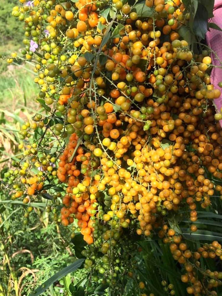 Chị chia sẻ, ngày còn bé ở quê, cây găng vốn là cây được nhiều gia đình trồng làm hàng rào quanh nhà. Đến mùa cây ra hoa tím rất đẹp, sau đó đậu quả và chín vàng rực cả bờ rào. Bọn trẻ con như chị khi ấy thường hái hoa, quả của cây này để chơi.