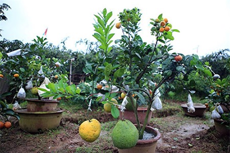 Những quả chanh đào vừa mới được ghép cành bên cạnh cam Canh, bưởi Diễn.