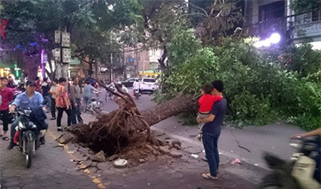 Khoảng 17h ngày 2/12, một cây quếch cổ thụ có đường kính hơn 50 cm cao khoảng 15 m trước cửa số nhà 30 phố Lê Văn Hưu (Hà Nội) bất ngờ bật gốc đổ ập xuống chắn ngang đường khiến giao thông tê liệt. |