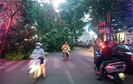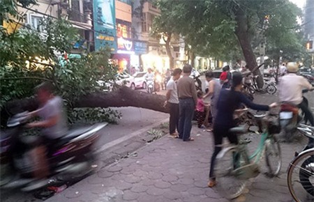 Cây đổ khiến các phương tiện không thể đi qua đây. Nhiều xe máy, xe đạp đi lên vỉa hè. |