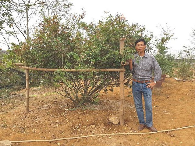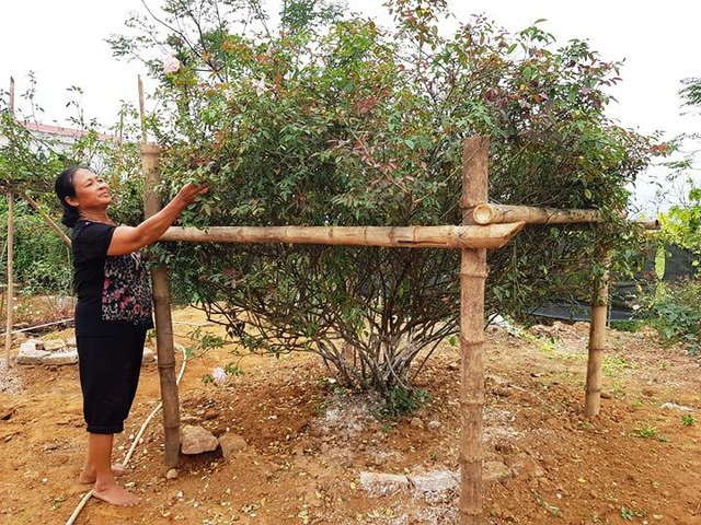 Theo anh Hưng, cây hồng phấn cổ này thời điểm hiện tại cũng thuộc vào loại hiếm có. Cây có hàng chục nhánh, thân cao hơn 2m, tán rộng cả chục mét nên anh Hưng phải dùng tre và luồng làm giá nâng lên. Năm tuổi, tán cây, độ cao của cây thuộc hàng độc.