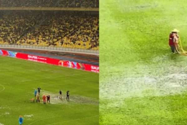 Theo truyền thông của Malaysia đưa tin, do thời tiết mưa lớn, BTC SVĐ Bukit Jalil đã buộc phải dùng cách thoát nước thủ công nhất đó là sử dụng xẻng và cuốc để đẩy nước. Trước đó, Giám đốc điều hành của sân vận động, ông Faidz Sanusi đã ngỏ ý muốn hoãn lại trận đấu, tuy nhiên BTC vẫn một mực quyết định để cho trận đấu diễn ra bình thường. Bên cạnh đó, ông Faidz Sanusi cũng không hài lòng về cách xử lí tình huống của BTC, bởi dùng xẻng và cuốc sẽ ảnh hưởng tới chất lượng mặt cỏ.