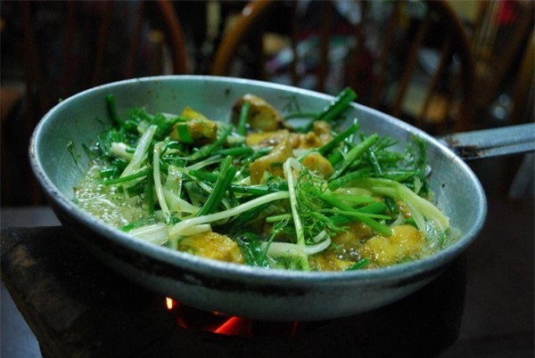 rán cùng rau thơm và hành tươi, ăn kèm bún và lạc rang, mắm tôm. Các món