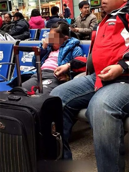 Hình ảnh hai cha con còng tay nhau tại nhà ga những ngày cuối năm đã khiến nhiều người phải chú ý.