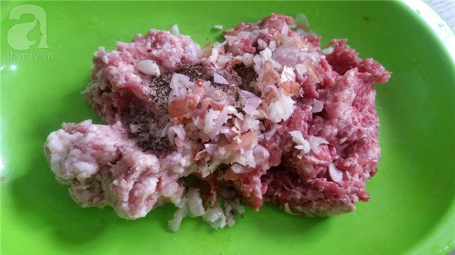 Trộn phần thịt bò và thịt nạc băm nhỏ vào với nhau cho đều. Hành củ đập dập, băm nhỏ cho vào trộn cùng thịt. Thêm vào phần thị 1 thìa cà phê tiêu, 1/2 thìa bột canh, 1/2 thìa bột ngọt. Khi đã trộn đều thì để thịt nghỉ khoảng 10 phút.