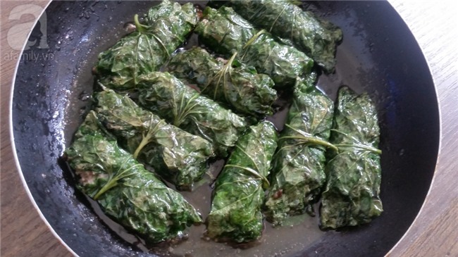 Trải lá lốt ra mâm, cho từng thìa thịt vào gần cuống lá rồi gói gọn lại. Làm lần lượt cho đến khi hết nguyên liệu.