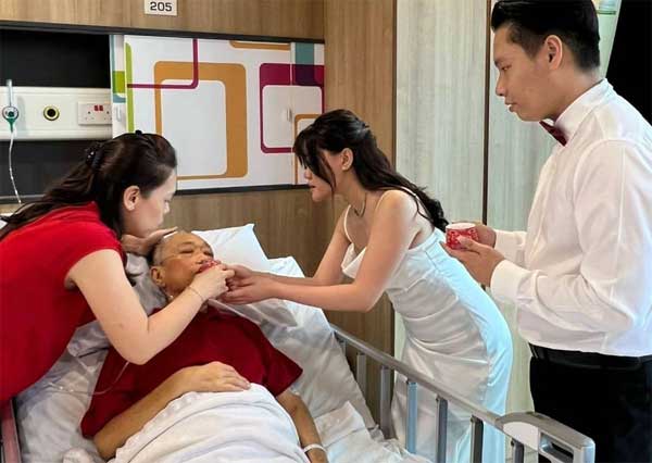 Với sự cho phép đặc biệt từ nhà an dưỡng, khoảng 7 thành viên trong gia đình đã có mặt trong buổi lễ. Mọi người đều xúc động khi chứng kiến chú rể dâng trà cho bố vợ đang nằm trên giường bệnh.