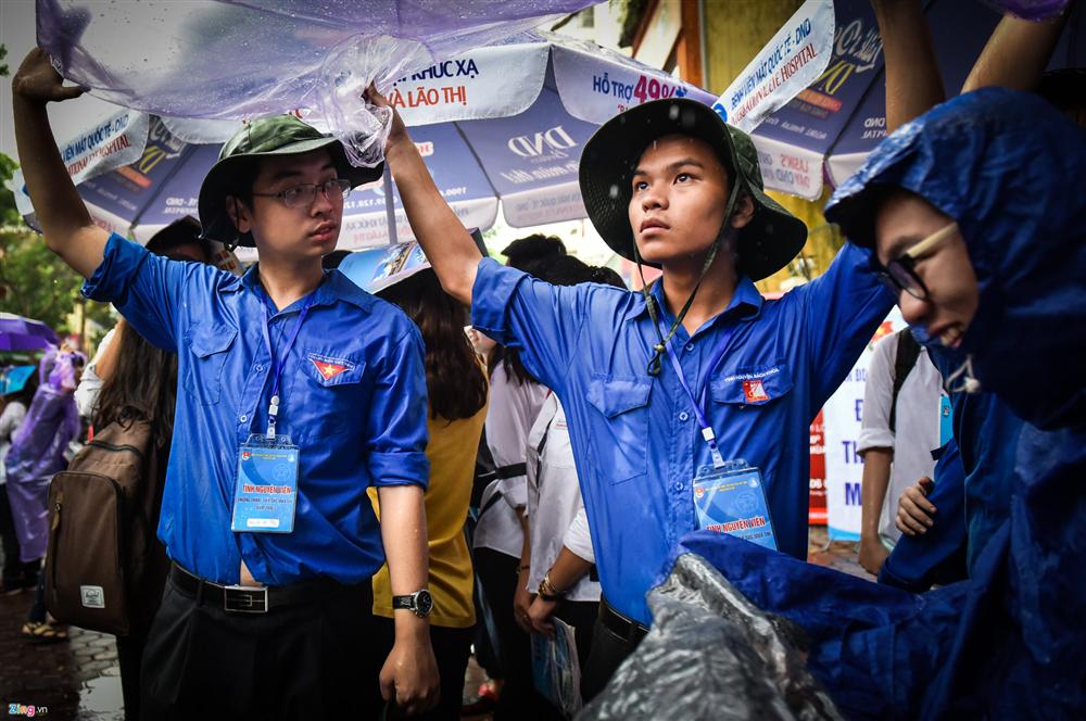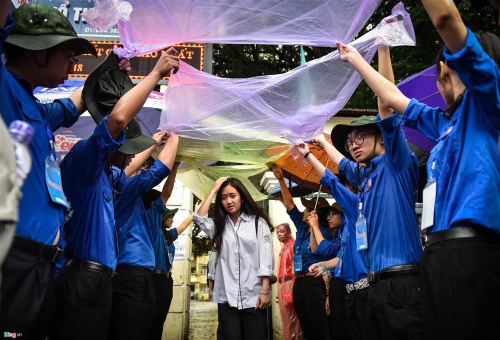 Tại điểm thi THPT Việt Đức (Hà Nội) các thanh niên tình nguyện của nhiều trường Đại học đã có sáng kiến lập hàng rào, dùng áo mưa che cho các em khỏi ướt.