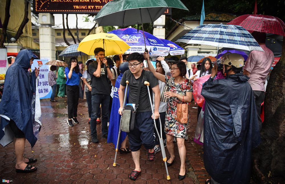 Thí sinh Phan Ngọc Long (THPT Việt Đức) chống nạng ra về sau khi kết thúc môn thi cuối cùng. Long bị gãy chân do tham gia trò chơi mạo hiểm cách đây 2 tháng. Trong suốt kỳ thi THPT 2018 cậu thường xuyên nhận được sự quan tâm giúp đỡ của thầy cô, bè bạn, gia đình và đội thanh niên tình nguyện.