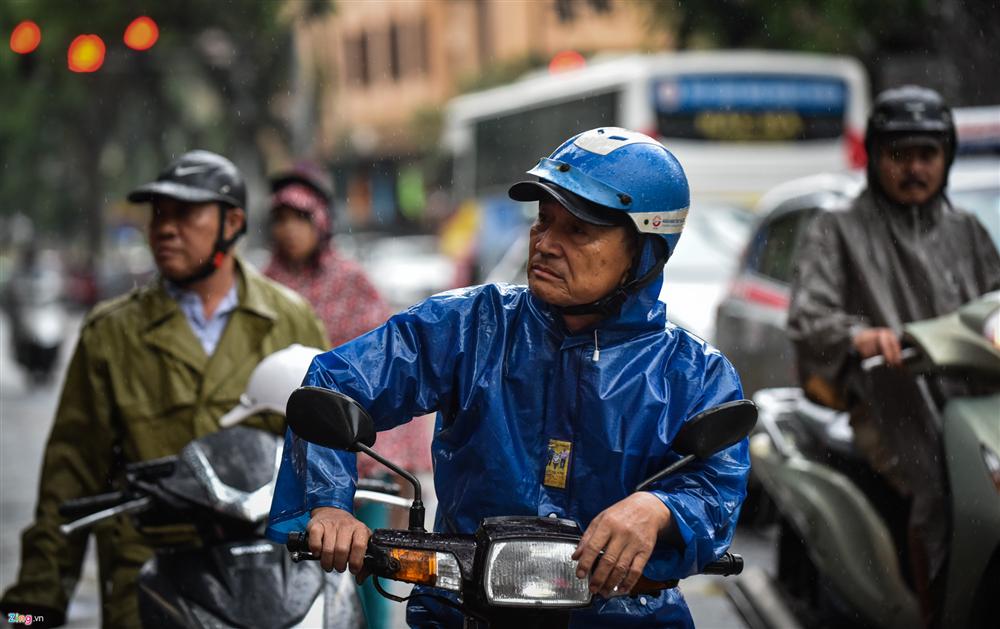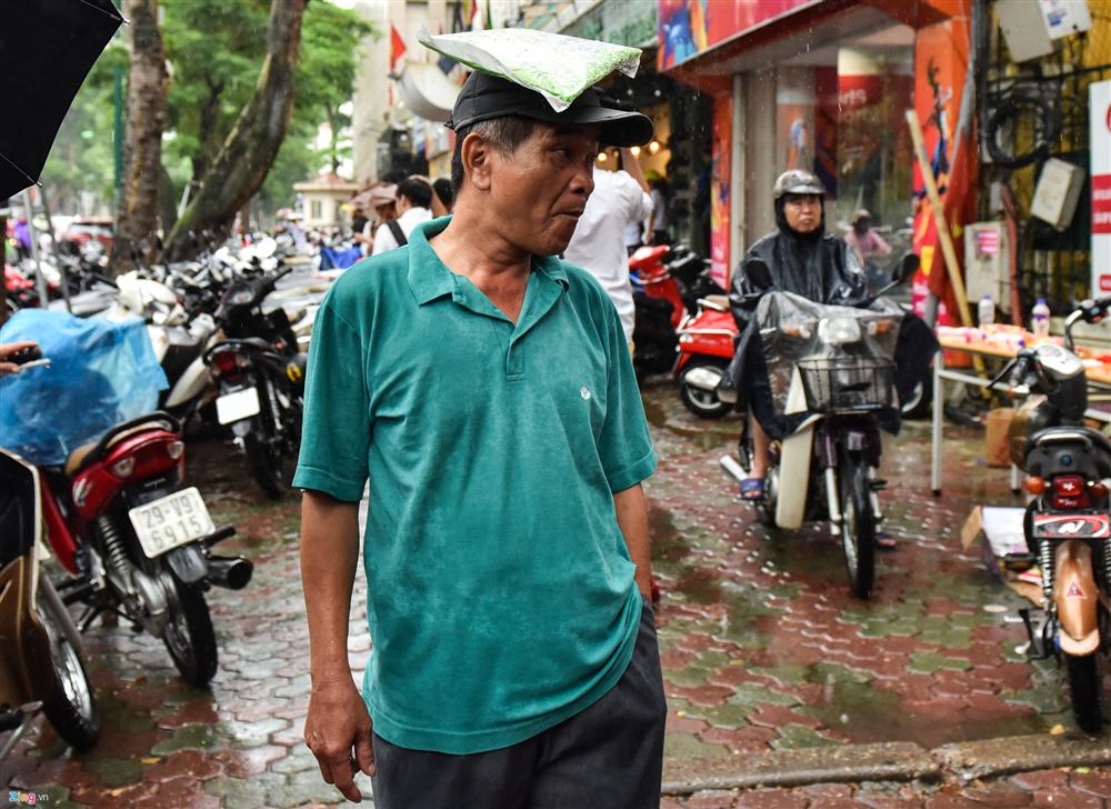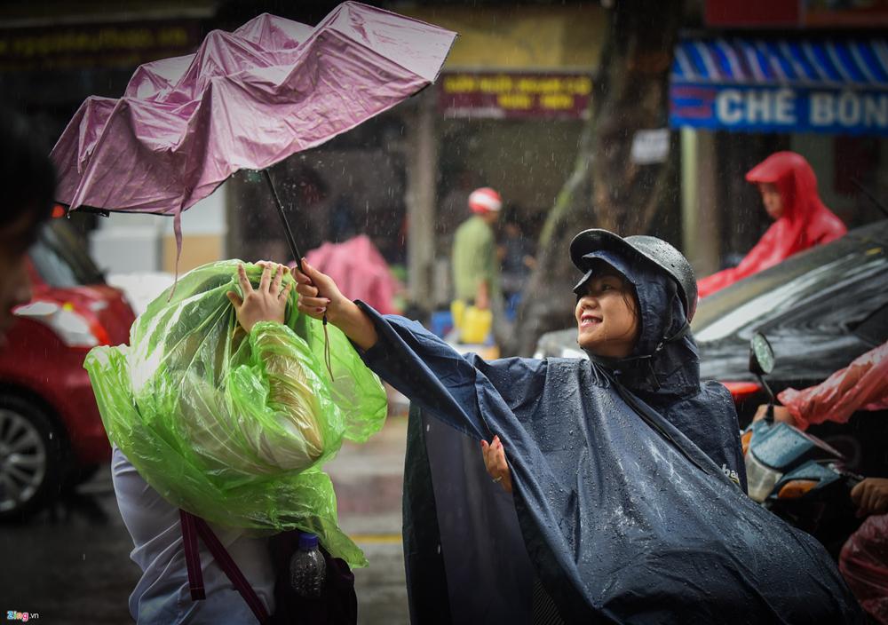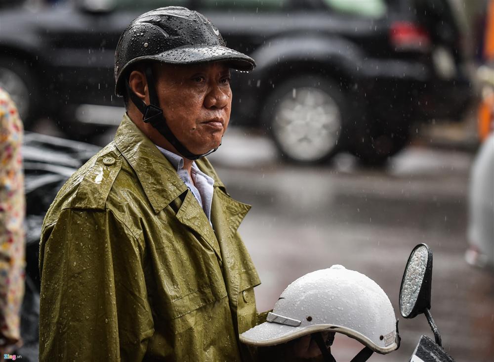 Nhiều phụ huynh ngóng con ngoài cổng. Ông Tuấn (quận Hoàn Kiếm) chỉ kịp mua một chiếc áo mưa mỏng nhưng không sử dụng mà để dành cho con gái mình.