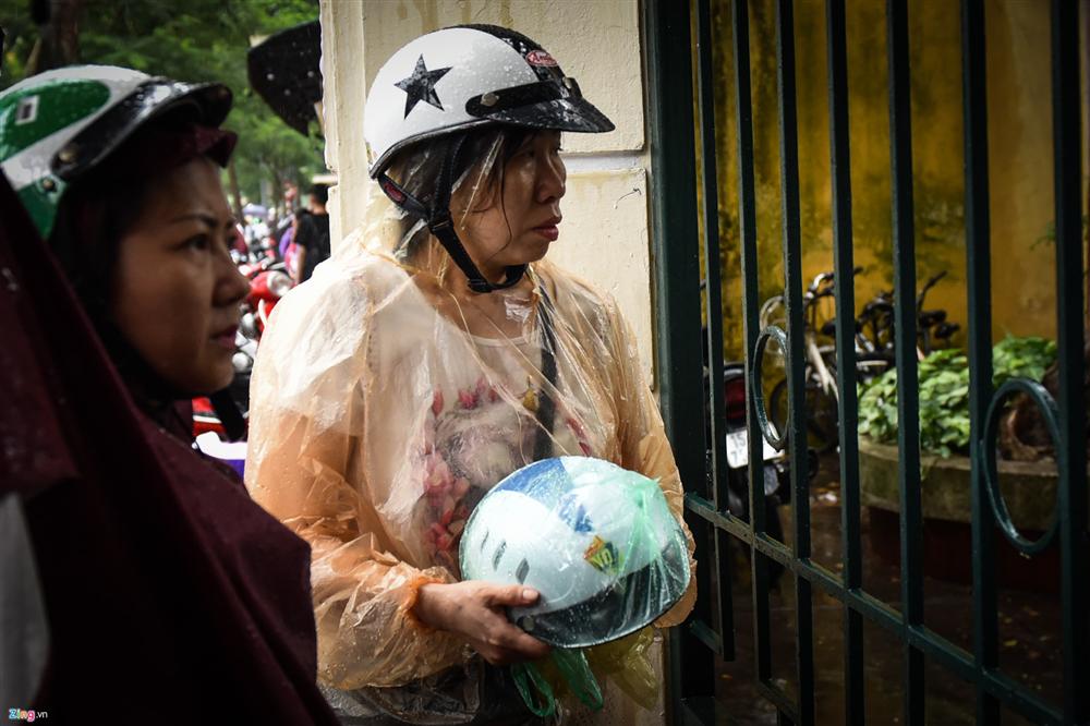 Cơn mưa nặng hạt đổ xuống bất ngờ khiến hàng trăm phụ huynh đợi ở bên ngoài bị ướt sũng.
