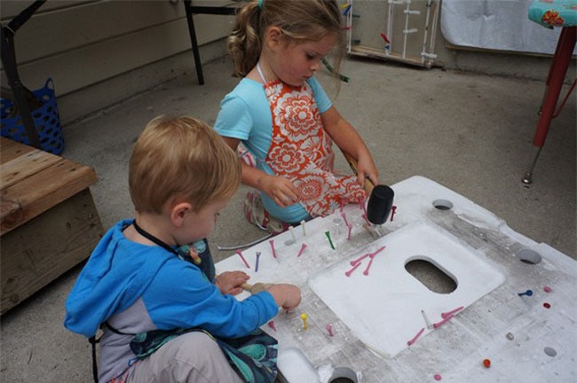 Đưa cho bé một chiếc búa nhỏ, vừa sức. Sử dụng một miếng gỗ mềm và cố định nó với kẹp hoặc chỉ đơn giản là đặt trên mặt đất rồi chọn chiếc đinh với một đầu lớn.