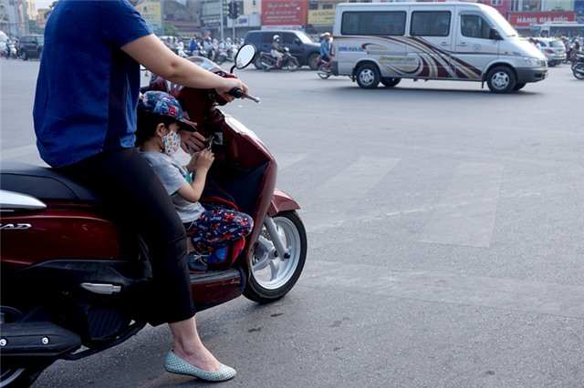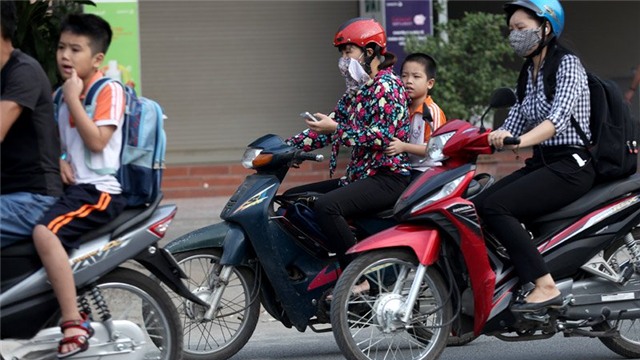 Vừa lái xe máy đưa con đến trường, vừa dùng điện thoại. |