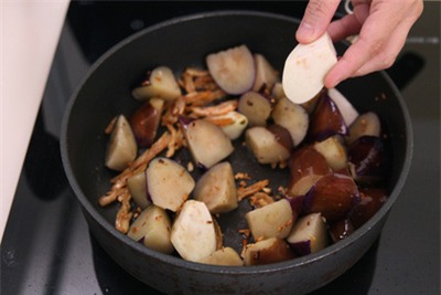 ![]() | ![]() Làm nóng chảo với chừng 200ml dầu, cho cà vào chiên cho săn chừng 1 phút rồi vớt ra đĩa có lót sẵn giấy thấm dầu. |