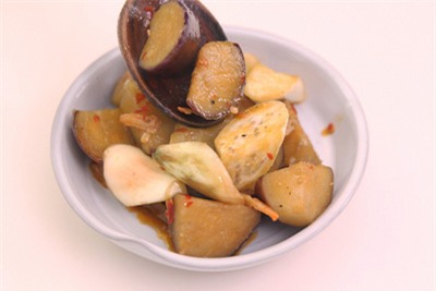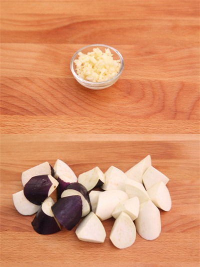![]() | ![]() Tỏi bóc vỏ, bằm nhỏ. Cà tím cắt bỏ cuống, cắt miếng vừa ăn rồi ngâm trong nước muối loãng cho khỏi thâm. Cá khô cũng ngâm nước cho nở mềm và sạch cát bẩn rồi vớt ra cho ráo. |