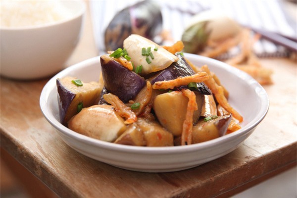 1 quả cà tím tròn 1 quả cà trắng 20g tôm khô 2 tép tỏi 50ml nước dùng gà (tùy ý) 2 muỗng canh tương ớt 1 muỗng canh đường 1 muỗng canh dầu hào 1 muỗng cà phê dầu mè |
