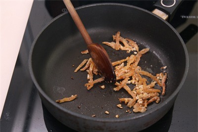![]() | ![]() Làm nóng chảo khác với chút dầu láng mặt, cho tỏi vào phi thơm rồi trút cá khô vào xào nhanh tay. |
