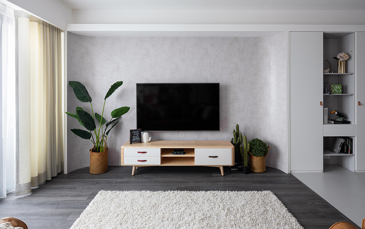 Góc đặt kệ tivi tạo điểm nhấn nhẹ nhàng với giấy dán tường màu ghi xám.