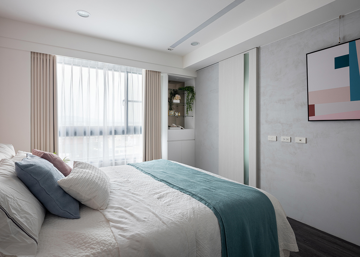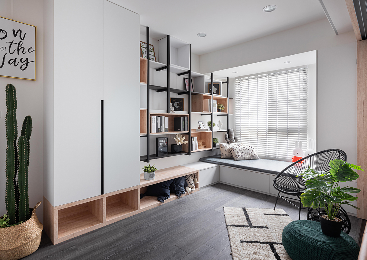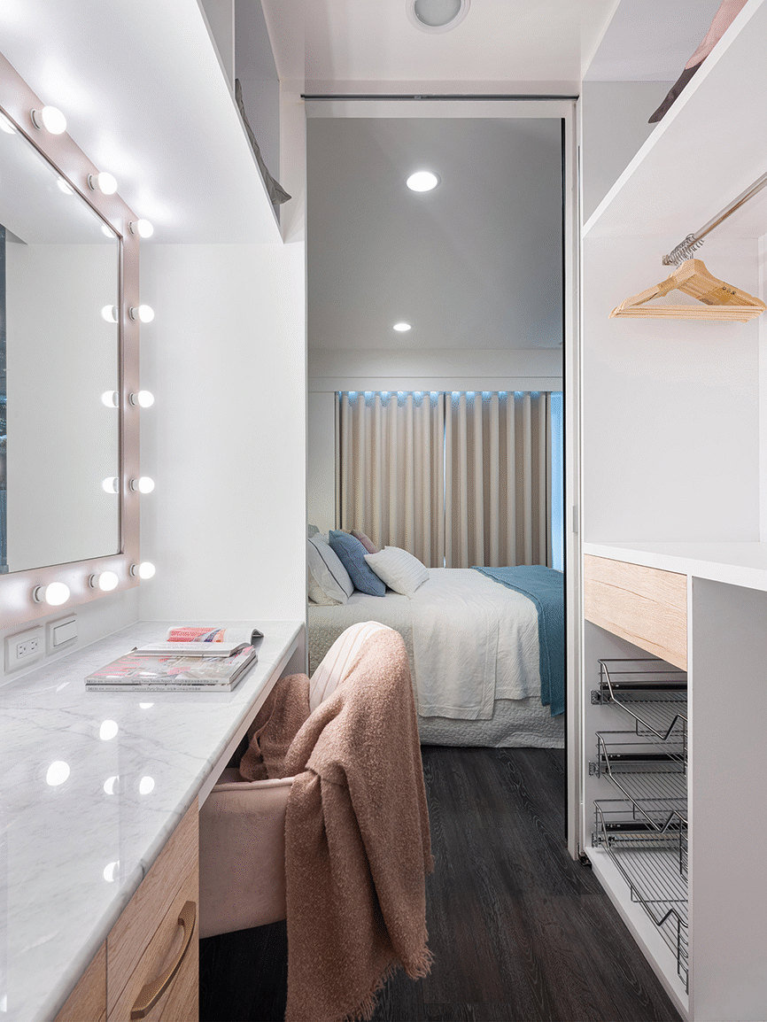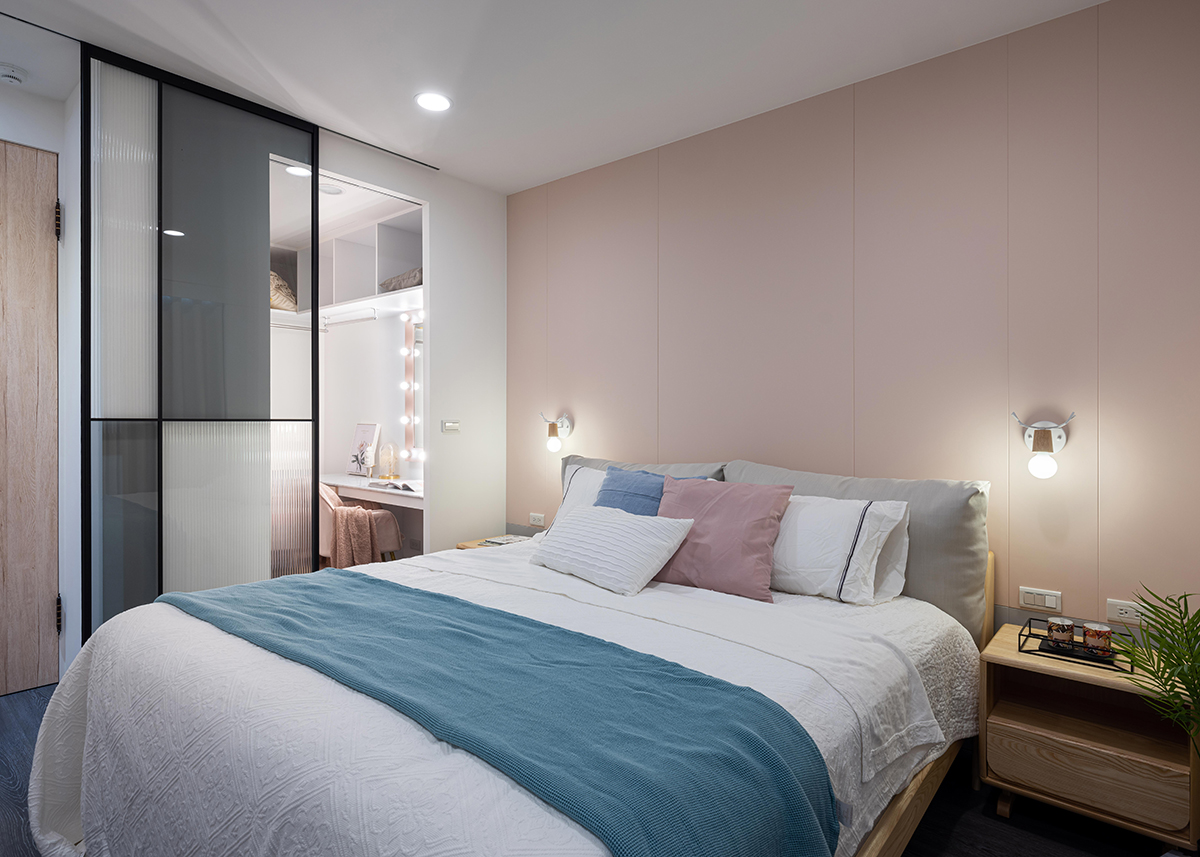Bên cạnh phòng ngủ còn có góc làm việc và tủ đựng đồ khá tiện lợi, riêng tư. Cách phân chia này giúp giảm bớt sự chật chội cho cùng một căn phòng nhưng đảm bảo đủ công năng cần thiết.