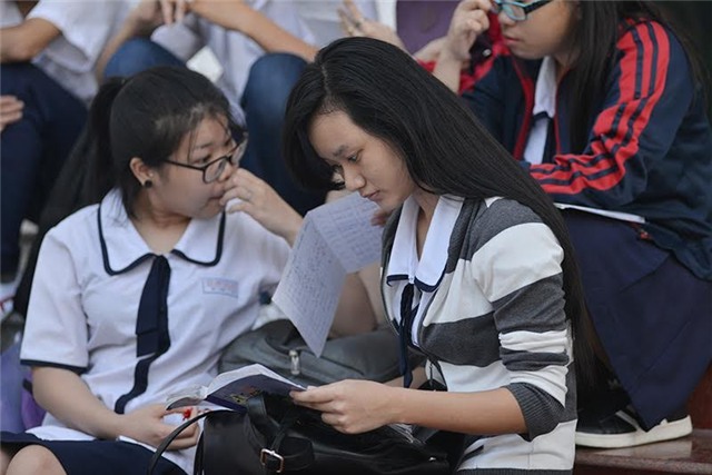 Thí sinh tranh thủ ôn bài trước giờ thi. Ảnh: Đinh Quang Tuấn |