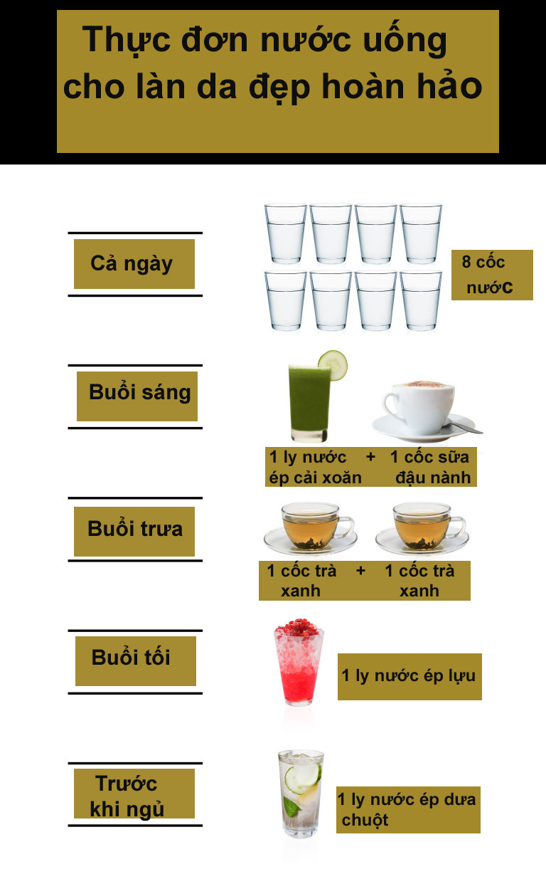 "Không có gì làm cho da trông tươi tắn, khỏe mạnh và tràn đầy sức sống hơn là việc uống nhiều nước mỗi ngày. Nước lọc giúp da giữ độ đàn hồi tốt nhất. Hãy uống đủ 8 ly nước mỗi ngày để có làn da khỏe mạnh.