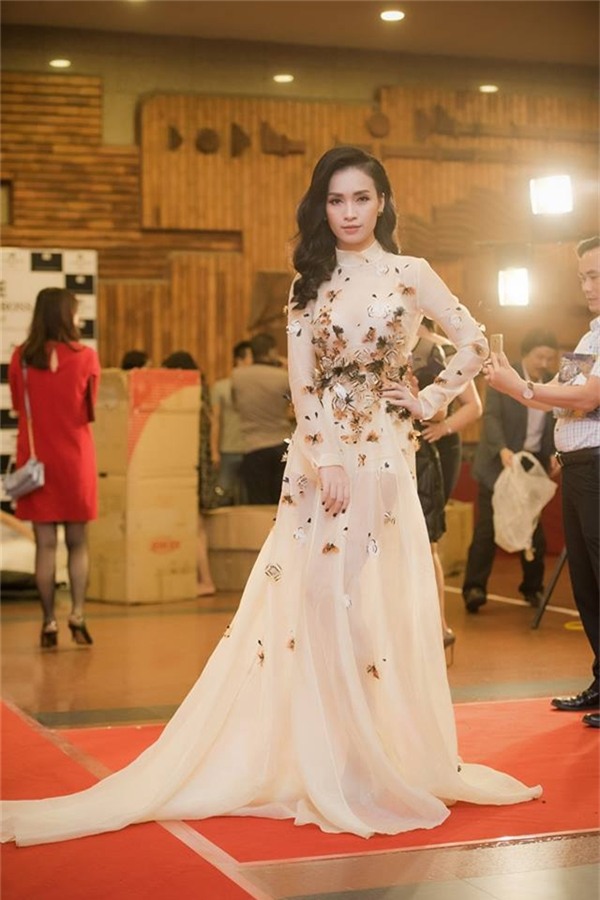 Sau đó vài ngày, diễn viên Mai Thu Huyền cũng diện lại bộ váy này. Bỏ qua vấn đề tuổi tác, Mai Thu Huyền có vẻ hơi kém cạnh đàn em với mái tóc uốn cổ điển khiến cô trông “dừ” hơn hẳn.