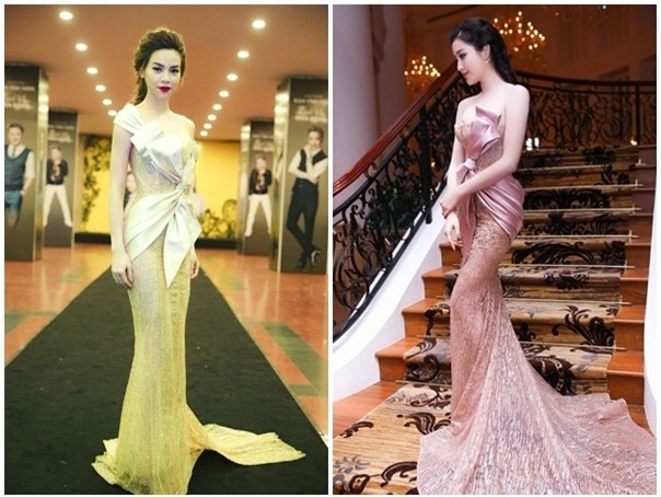Hồ Ngọc Hà chính là người đầu tiên đã diện bộ váy đuôi cá này sau đó, Á hậu Huyền My diện lại. Tỉ lệ hình thể cân đối đã giúp cả 2 ghi điểm khi “đụng hàng”.
