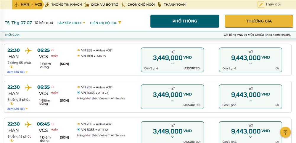 Trên hệ thống đặt vé máy bay của Vietnam Airlines, chặng bay Hà Nội - Côn Đảo lúc 22h30 phút ngày 7/7 có giá 3.449.000/vé phổ thông và 9.443.000/vé thương gia.