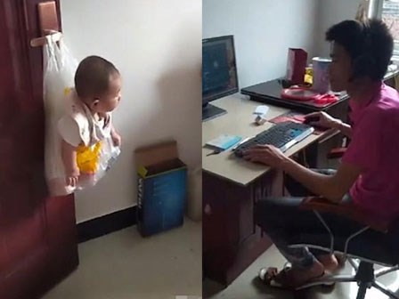 Bận chơi game, ông bố sáng tạo ra cách cho con vào túi nilon rồi treo lên cửa