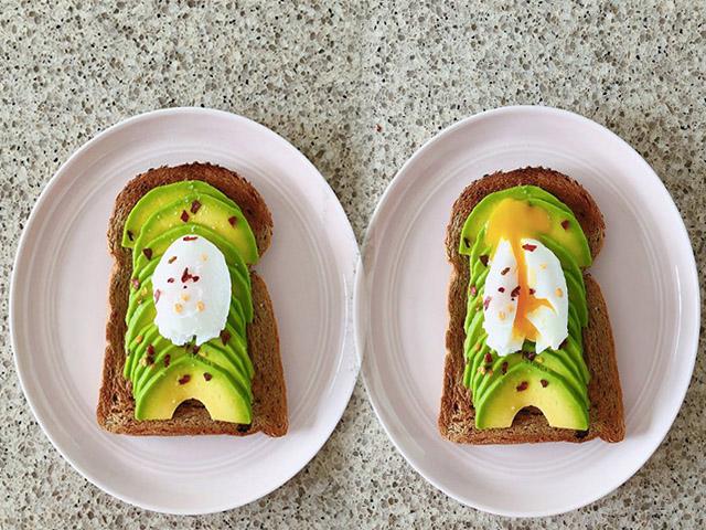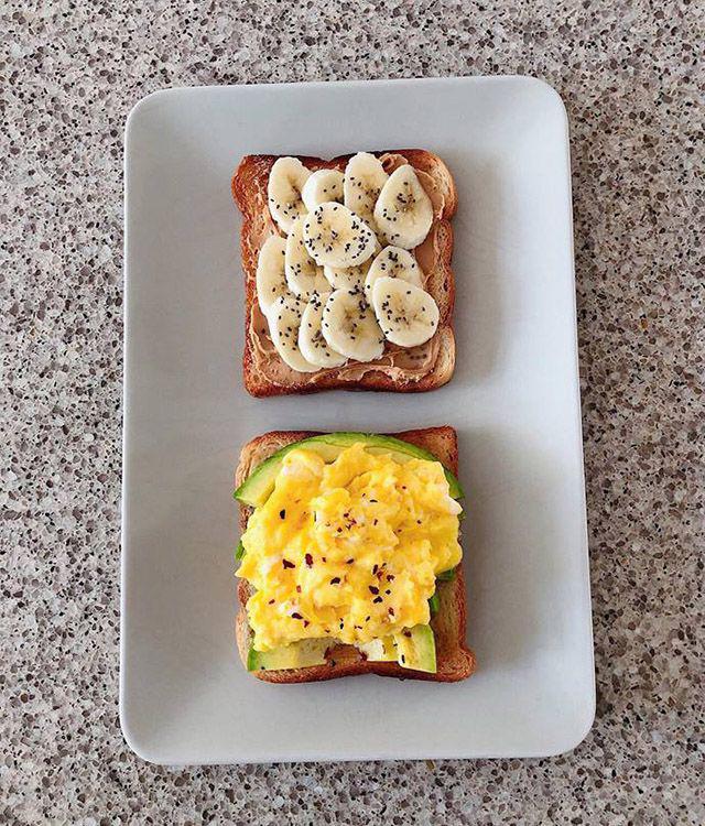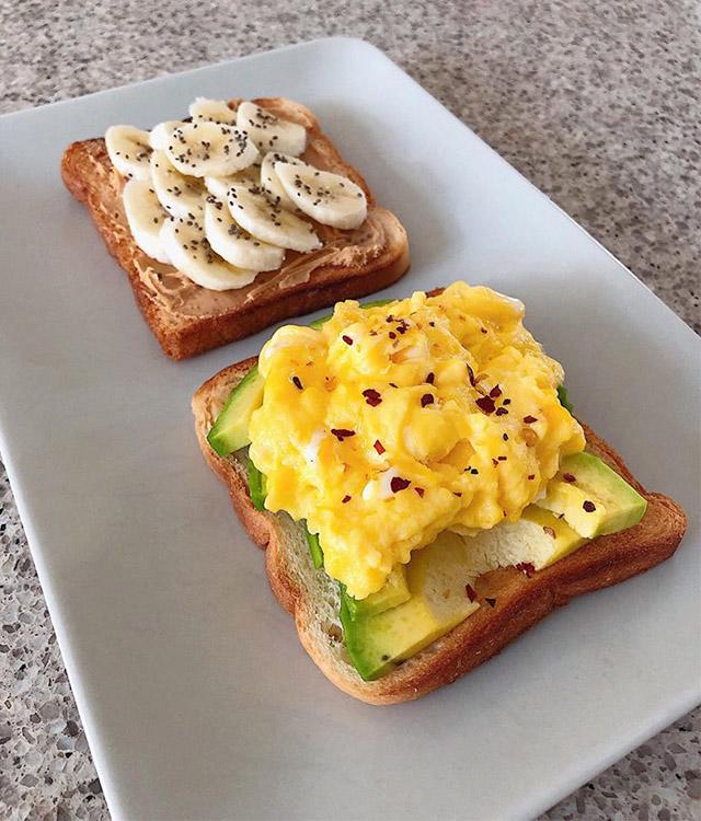 Như các nàng thấy, bữa ăn sáng chuẩn xịn của Hà Tăng chỉ là 2 lát bánh mì được phủ đầy chuối, bơ, một ít trứng.