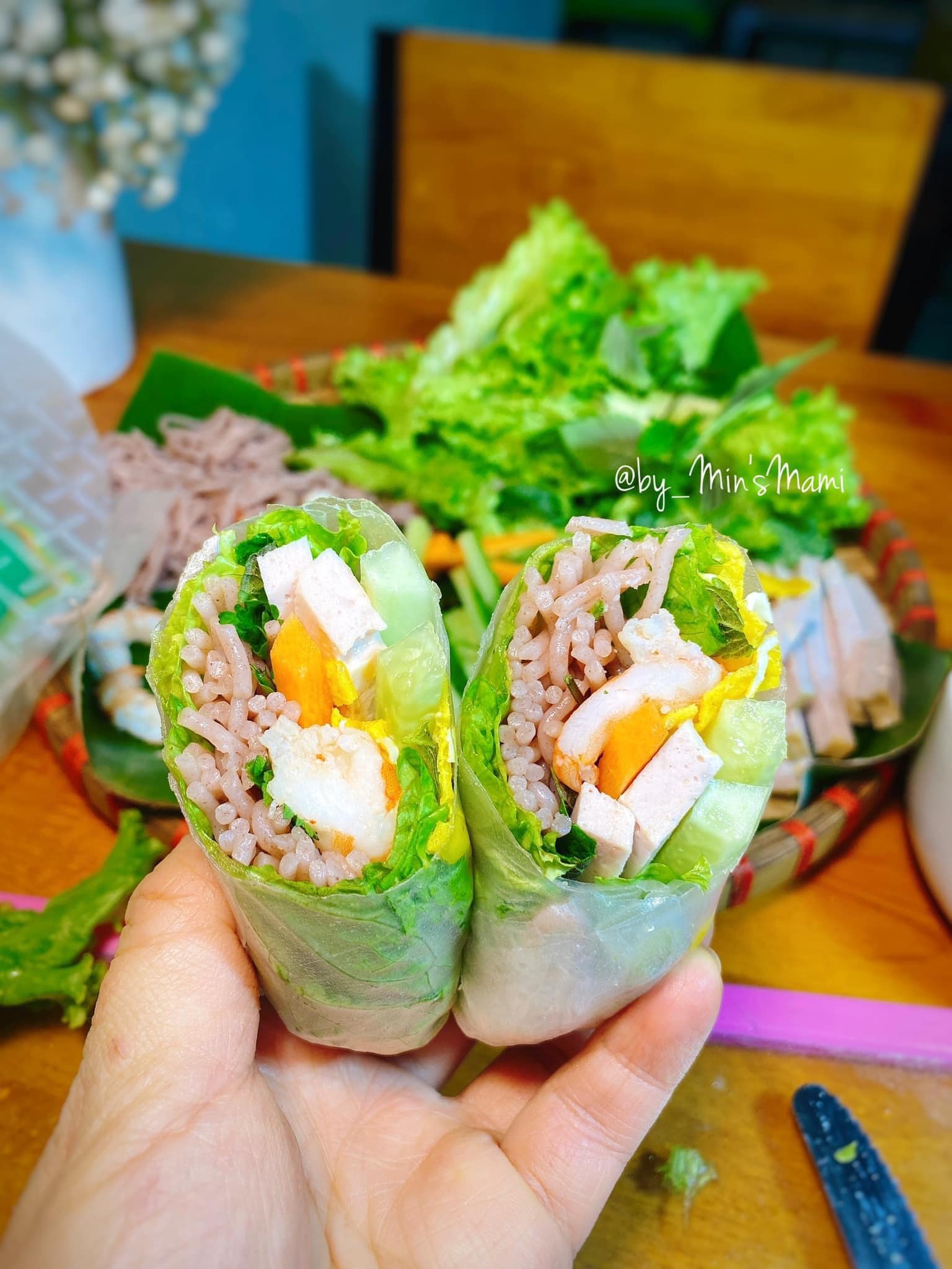 Đây là món bún nem tôm rau củ và bún lứt nem chay chị Loan chế biến. Nhân nem chay gồm có: đậu phụ nghiền nát, mộc nhĩ, nấm hương, miến, củ đậu, cà rốt, hành tây, rau thơm, chút hạt nêm, tiêu...