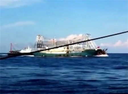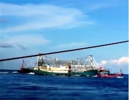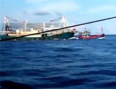 | Chiếc tàu vỏ sắt của Trung Quốc truy đuổi tàu cá (màu đỏ) của Việt Nam |