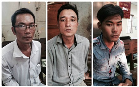 Các nghi phạm tại cơ quan điều tra Trương Khắc Bảo (trái) Kiều Ngọc Lịch (giữa) và Phạm Nguyễn Thanh. |