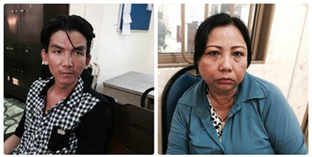 "Nữ quái" cầm đầu (phải) chỉ đạo nghi phạm Minh (trái) trực tiếp giật cọc tiền. |