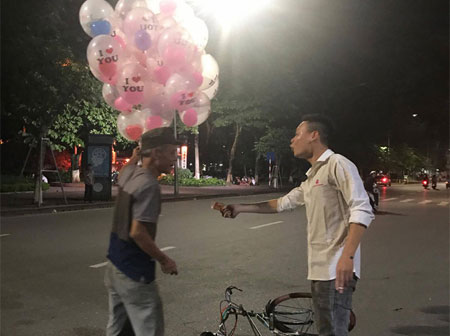 Hình ảnh cụ già và chùm bóng bay màu hồng nổi bật khiến người người chú ý. Ai cũng cảm thấy thương cảm khi cụ già phải thả từng quả bỏng bay, cũng là chút vốn liếng ít ỏi của mình bay lên trời. Và trong hoàn cảnh ấy, một chàng thanh niên trẻ đã giúp cụ già mua hết toàn bộ số bóng còn lại. Dù số tiền chàng trai còn lại không nhiều, nhưng số tiền ấy đã giúp đỡ được cụ già trong lúc khó khăn, để những quả bóng không bay đi một cách vô nghĩa.