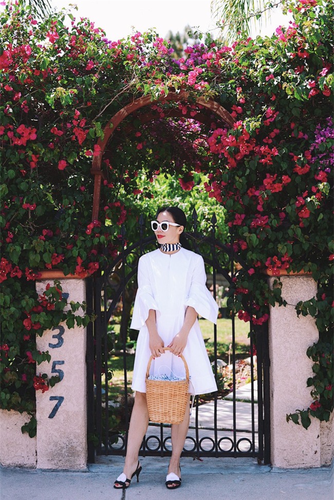 Nếu sợ rằng mặc váy trắng sẽ khiến mình thật đơn điệu thì bạn có thể xách thêm túi cói và đeo khăn vuông như cô nàng này xem sao.