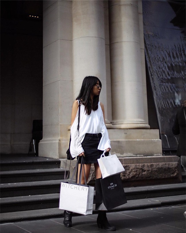 Dưới bàn tay khéo léo của Kristy Wu, chiếc áo trắng xẻ vai điệu đà bỗng trở nên cá tính và chất chơi hơn hẳn. Để tạo sự khác biệt, cô cũng không ngại diện boot đen da bóng.