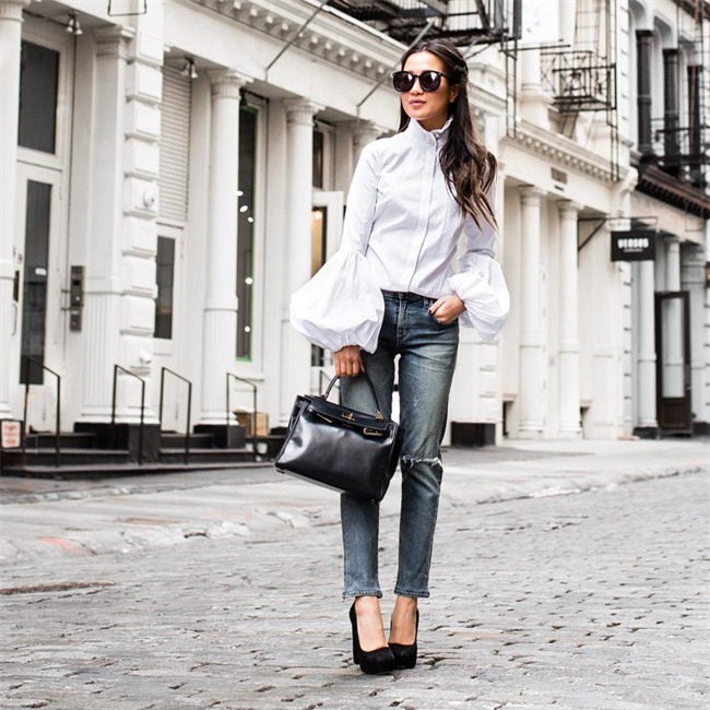 Set đồ của Wendy Nguyen chính là set đồ lý tưởng của mọi cô nàng công sở. Áo sơmi tay phồng, quần skinny jeans cùng túi vuông size nhỡ dường như sinh ra là để dành cho nhau.