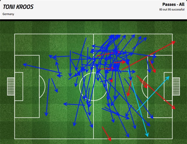 Ai cũng biết, "trạm trung chuyển bóng" lớn nhất của Đức là Toni Kroos. Tiền vệ này đêm qua đã chuyền thành công 85 đường. Tuy nhiên 9/10 đường chuyền hỏng còn lại, là những pha bóng phát động tấn công đích thực, chuyền lên và hướng thẳng vào vòng cấm địa đối phương.