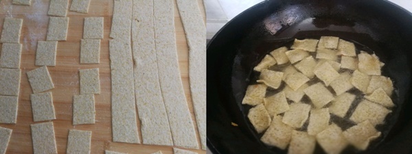 Cắt tấm bột thành từng chiếc bánh nhỏ, dùng nĩa chọc vài lỗ nhỏ trên bề mặt bánh. Đun nóng dầu ăn trong chảo, cho bánh vào chiên cho chín vàng giòn là được. Vớt bánh ra đĩa có lót giấy thấm dầu. Để bánh nguội rồi cho vào túi, xóc với chút muối, bột tiêu và thì là.